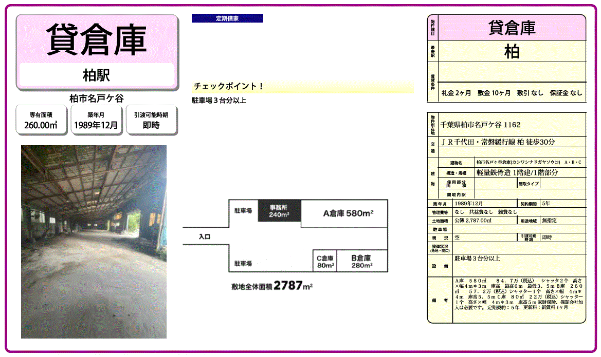*面積:A580m2、B260m2、C80m2 *5年定期建物賃貸借契約 *再契約料:新賃料の1ヶ月分 *天井高:A3.5m~6m、B5.5m、C5m *保証会社加入要 *家財保険加入要 |