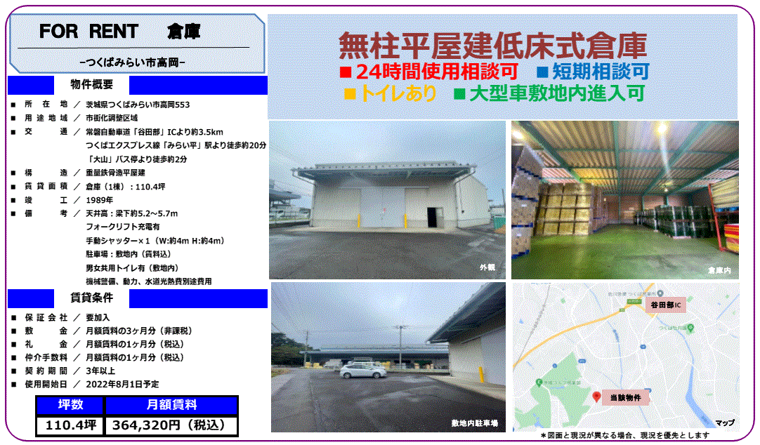 *梁下約5.2m~5.7m *保証会社加入要 *機械警備:月額11,000円 *水道使用料:月額5,500円(税込) |