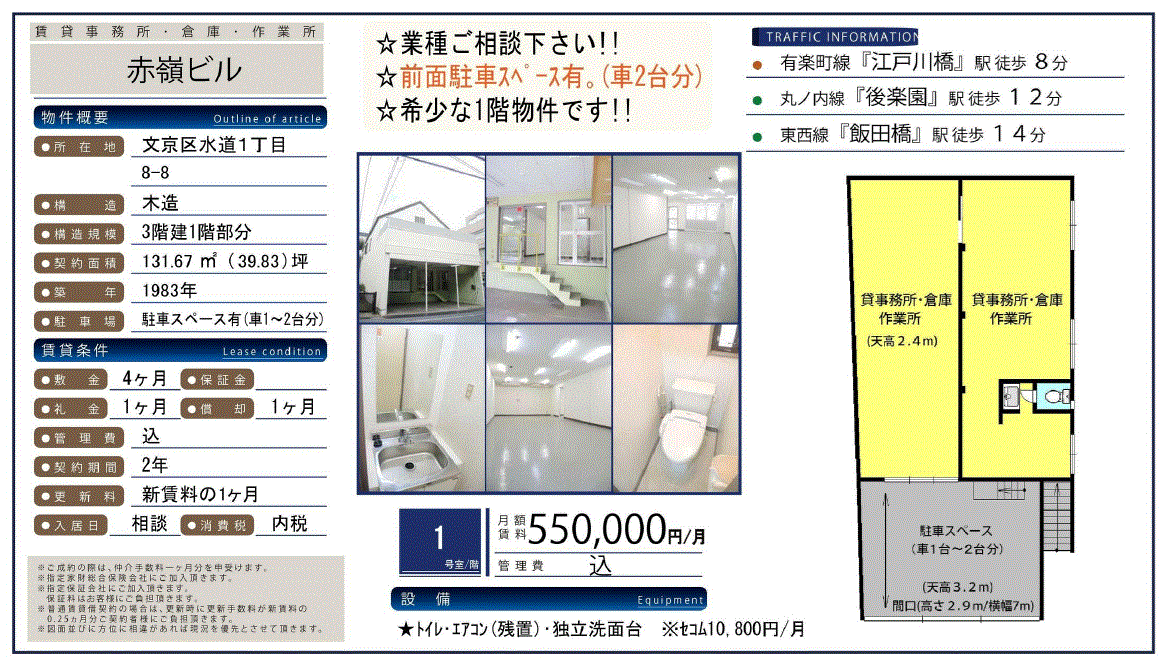有楽町線/江戸川橋駅 徒歩8分 丸ノ内線「後楽園」徒歩12分/総武中央線「飯田橋」徒歩14分 |