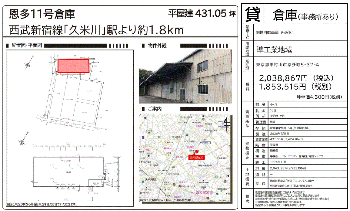 | 周辺状況 | 野火止通り沿い 近隣民家有 大型進入可 | ||