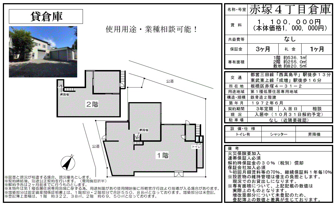 *3年定期建物賃貸借契約 *梁下4.1m *火災保険加入要 *保証会社加入要 |