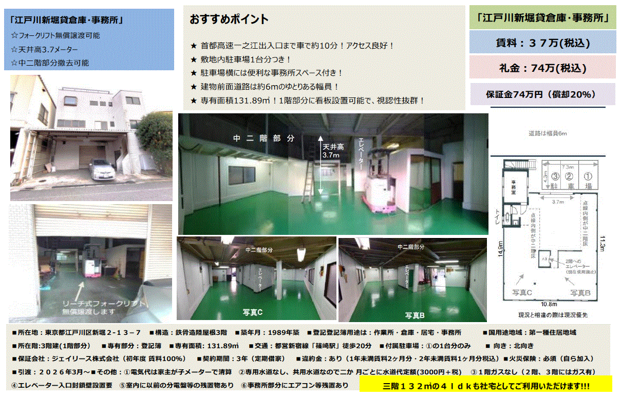 *3年定期建物賃貸借契約 *天井高3.7m *中2階あり(撤去可能) *フォークリフト無償譲渡可能 *看板設置可能 *指定保証会社加入要 *火災保険加入要 *中途解約時、解約違約金あり *水道代:2ヶ月毎、定額3,000円(別途消費税) *EV入口封鎖壁設置要 |