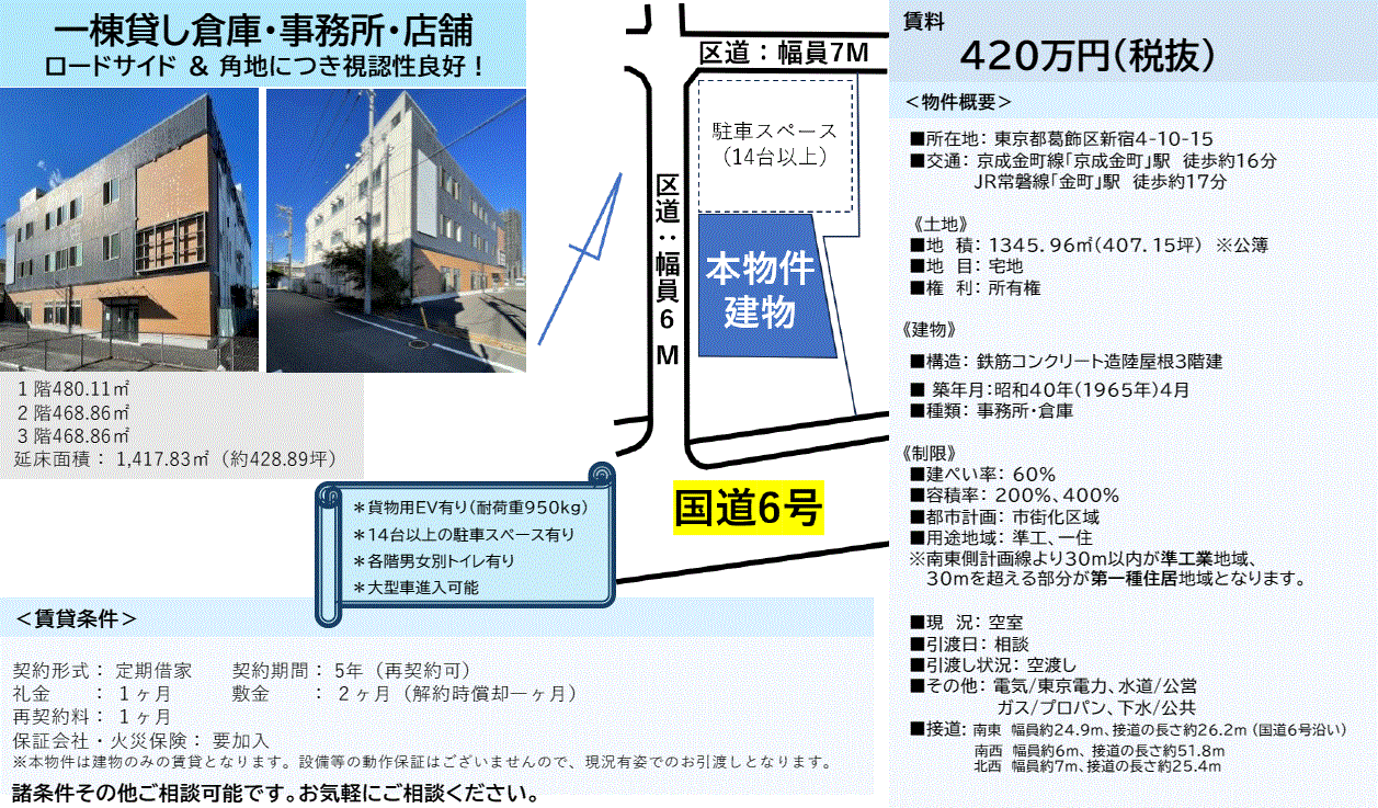 | 沿線/駅 | 京成金町線/京成金町駅 徒歩16分 | 高速道路出入口 | |
