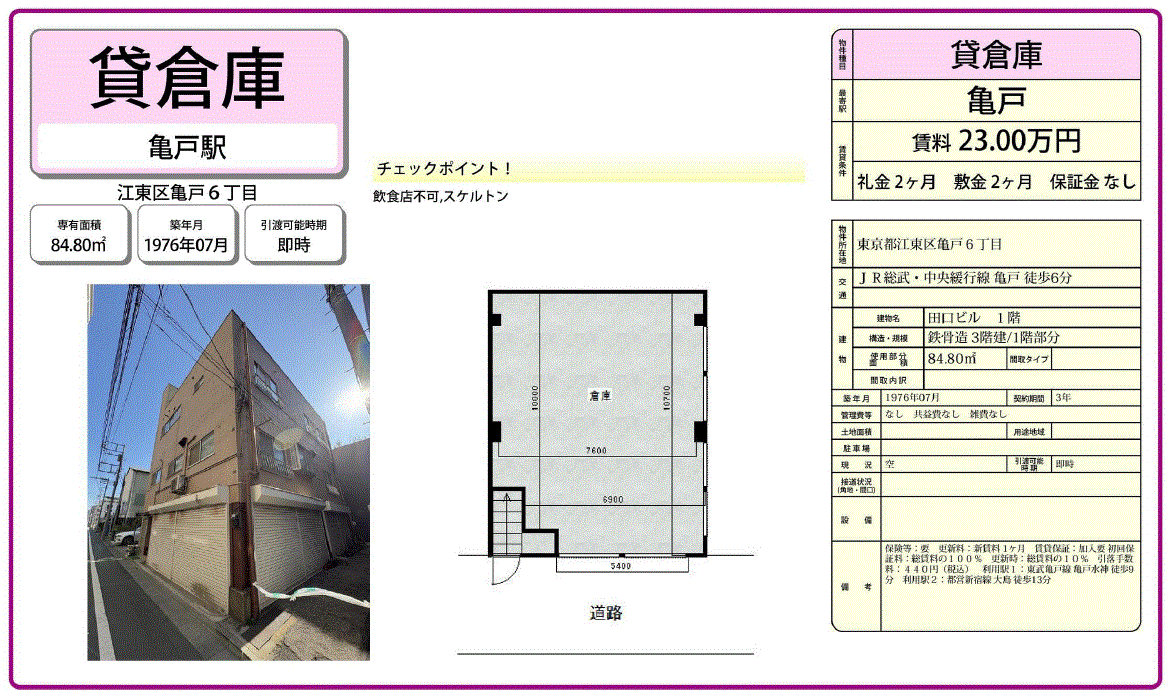 | 建物面積 | 84.8m²/25.65坪 | 構造/階数 | 鉄骨造/3階建ての1階部分 |
