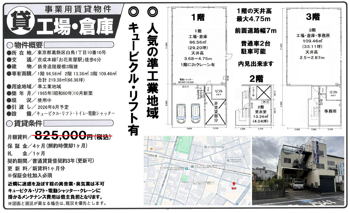 *1階一部対象外 *1階天井高最大4.75m *設備の保守点検等の費用については全て借主負担 *入居時期前倒し応相談 *保証会社加入要 |