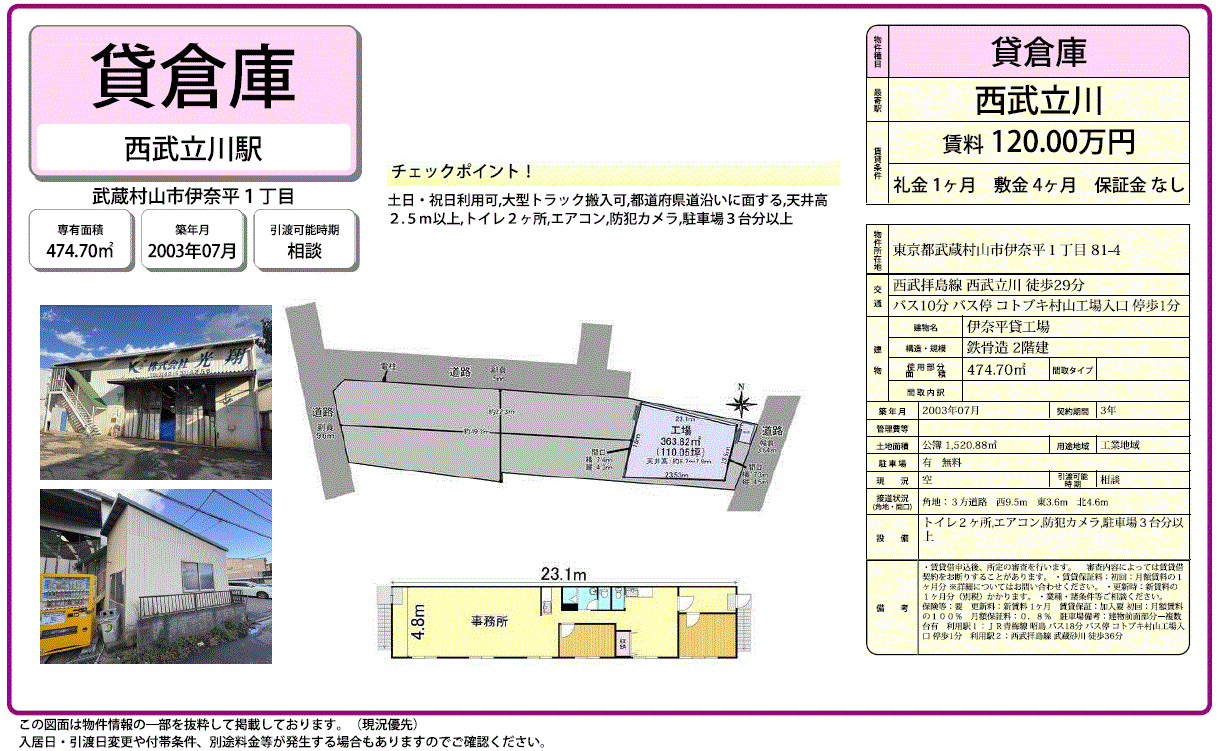 | 周辺状況 | 土日祝利用可 大型トラック搬入可 近隣民家有 | ||