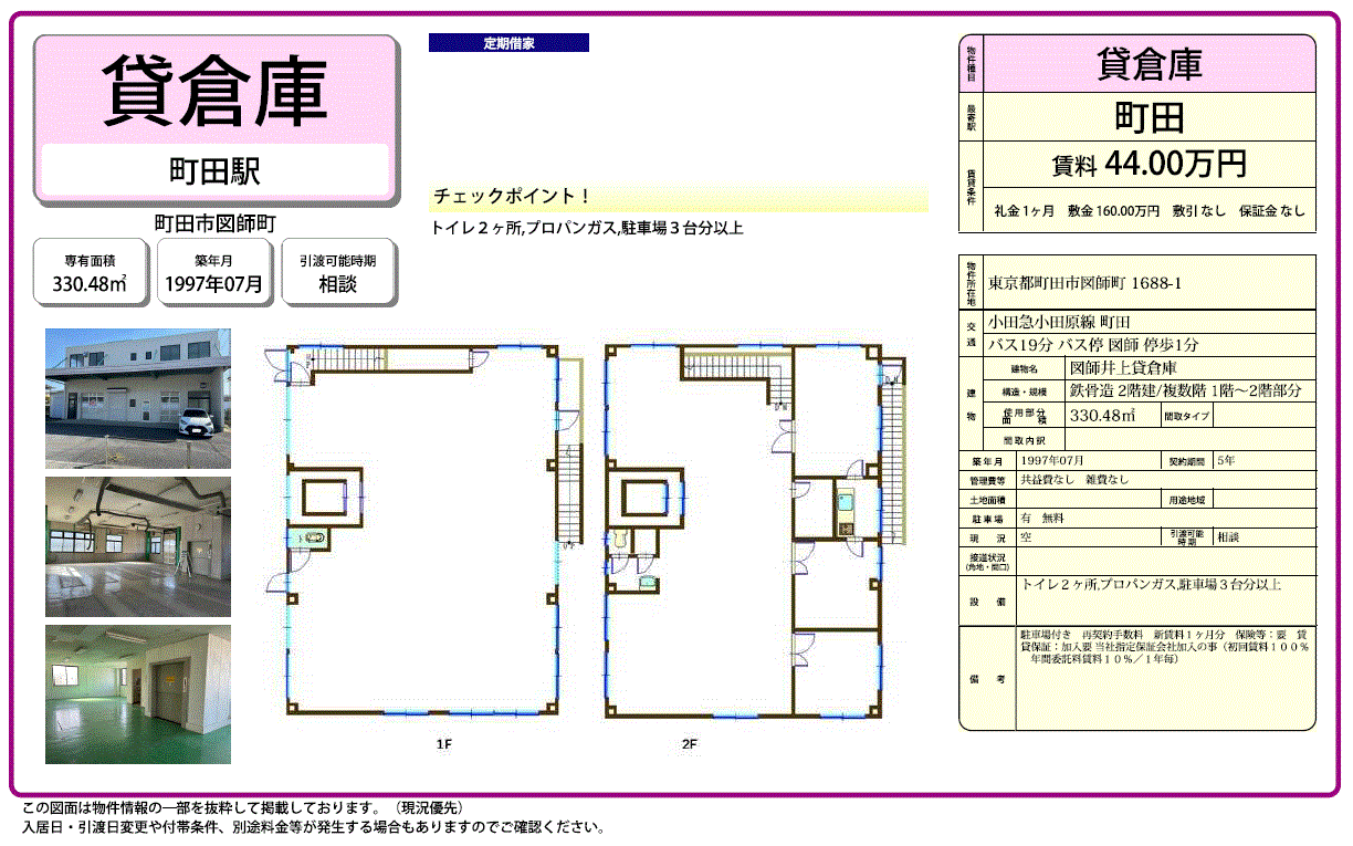 | 建物面積 | 330.48m²/99.97坪 | 構造/階数 | 鉄骨造/2階建ての1~2階部分 |