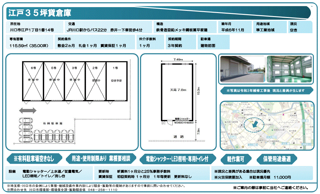 | 設備関連 | 電気引き込み有 上水道 流し台 トイレ 電動シャッター LED照明 | ||