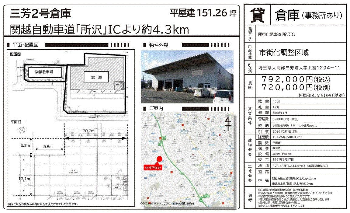 沿線/駅 | 東武東上線/鶴瀬駅 徒歩20分以上 | 高速道路出入口 | 関越自動車道 所沢から約4km |
