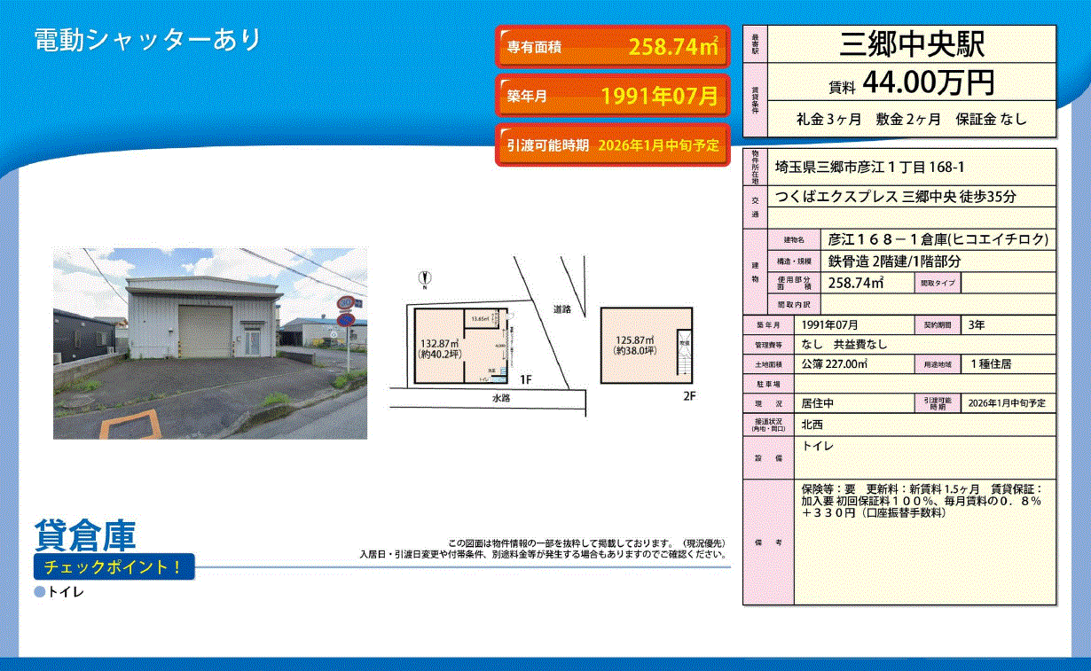 | 設備関連 | トイレ 電気引き込み有 電動シャッター 上水道 流し台 | ||