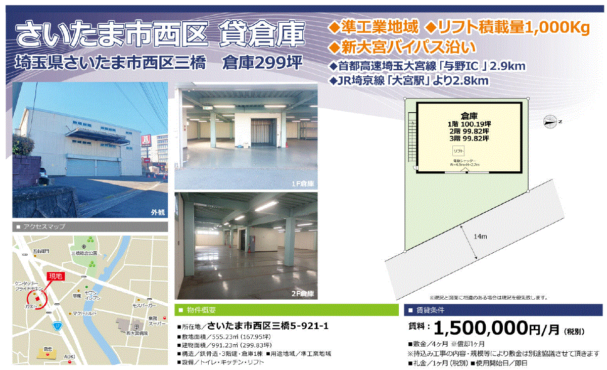| 沿線/駅 | 埼京線/大宮駅 徒歩20分以上 | 高速道路出入口 | 首都高速埼玉大宮線 与野から約3km |