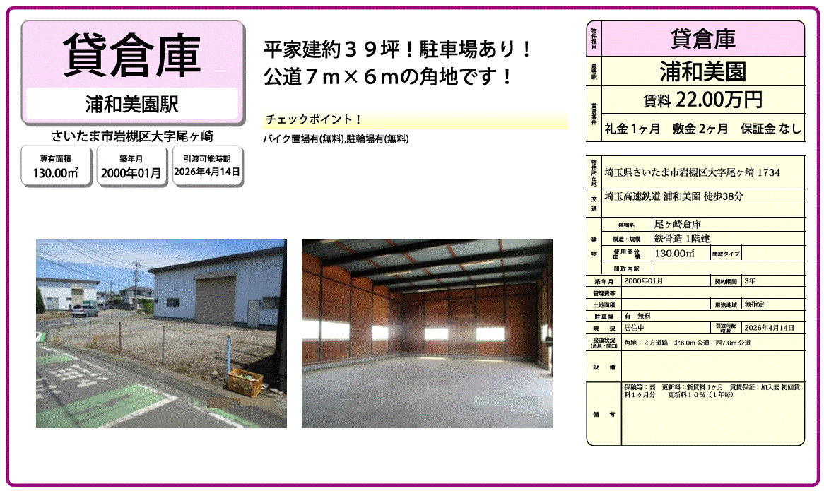 | 建物面積 | 130m²/39.33坪 | 構造/階数 | 鉄骨造/平家建 |