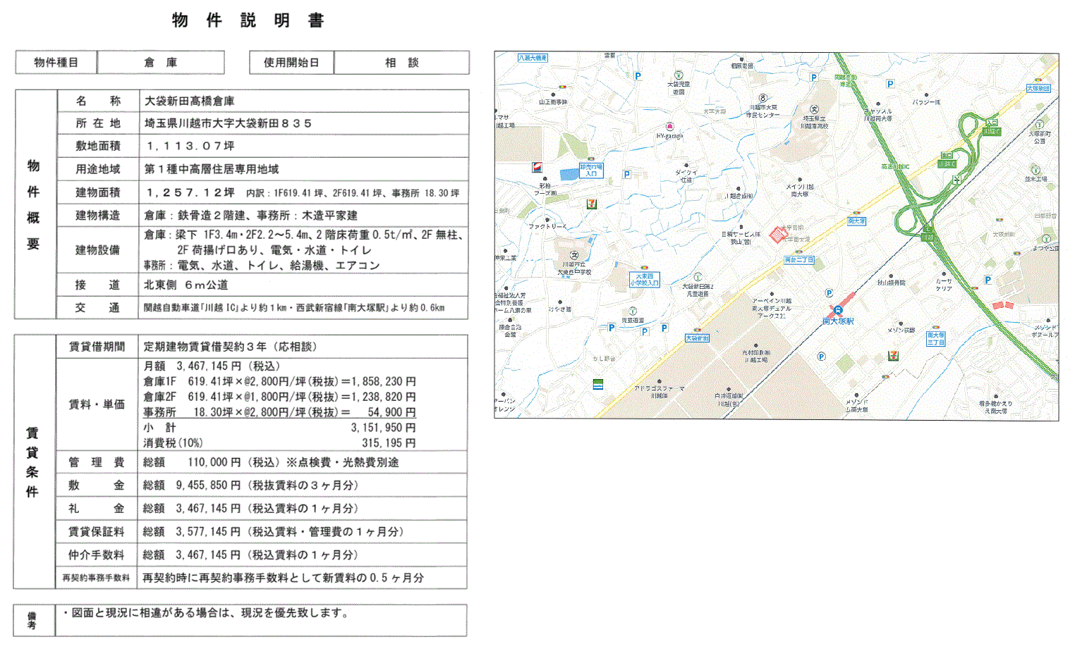 *倉庫:鉄骨造2階建(各階619.41坪、梁下:1階3.4m 2階2.2m~5.4m、2階床荷重0.5t/m2、2階無柱、荷揚げ口あり) *事務所:木造平家建(18.3坪) *3年定期建物賃貸借契約 |