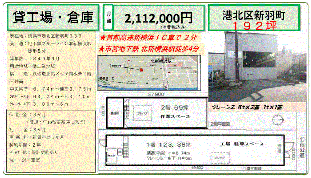 クレーン付き工場倉庫 2.8t×2基、1t×1基 駅近徒歩5分 一棟貸し 首都高速神奈川7号横浜北線「新横浜インター」約400m(直線距離) |