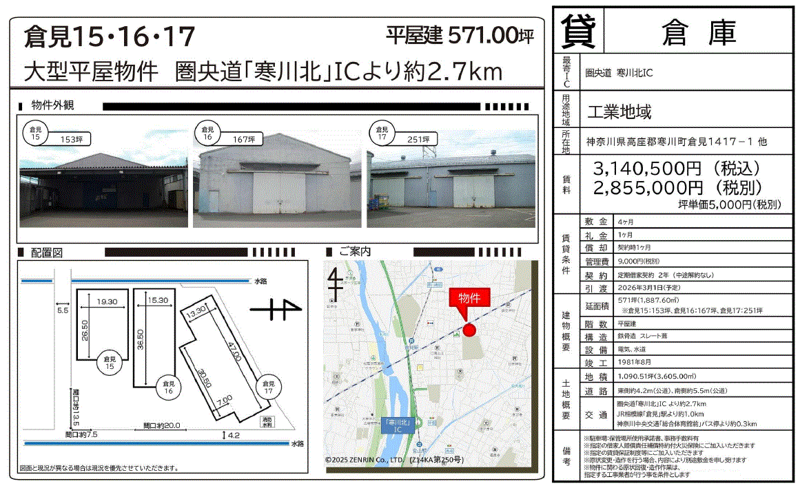 *2年定期建物賃貸借契約(中途解約不可) *倉見15号:153坪、倉見16号:167坪、倉見17号:251坪 *指定火災保険加入要 *指定保証会社加入要 |