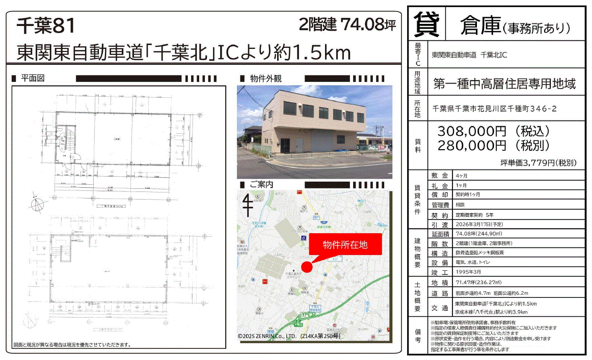 *5年定期建物賃貸借契約 *天井高:1階倉庫4.0m、2階事務所3.0m 床荷重500kg/m2 *指定借家人賠償責任付火災保険加入要 *指定保証会社加入要 *原状変更、造作を行う場合、内容により別途敷金を申し受けます *建物本体に関わる原状回復、造作作業は指定する工事業者が行う事を条件とします ※写真は、以前の募集当時に撮影したものなので、現況と異なる場合があります。現況優先となります。 |