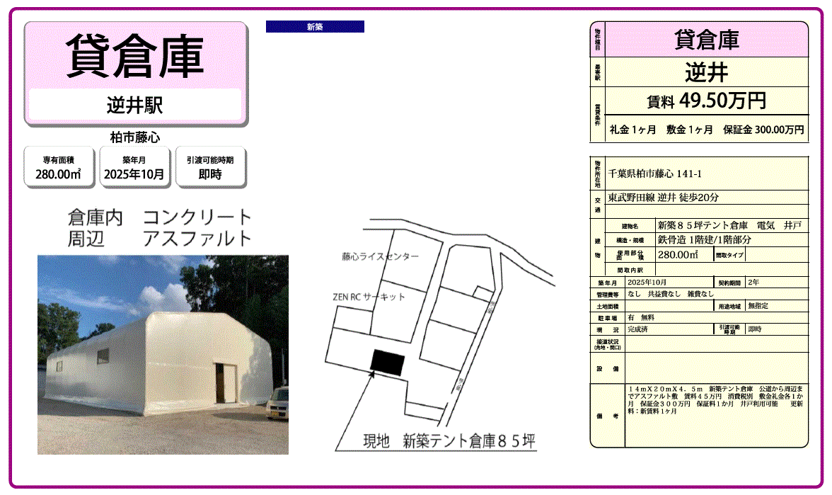 建物面積 | 280m²/84.7坪 | 構造/階数 | 鉄骨造/平家建 |