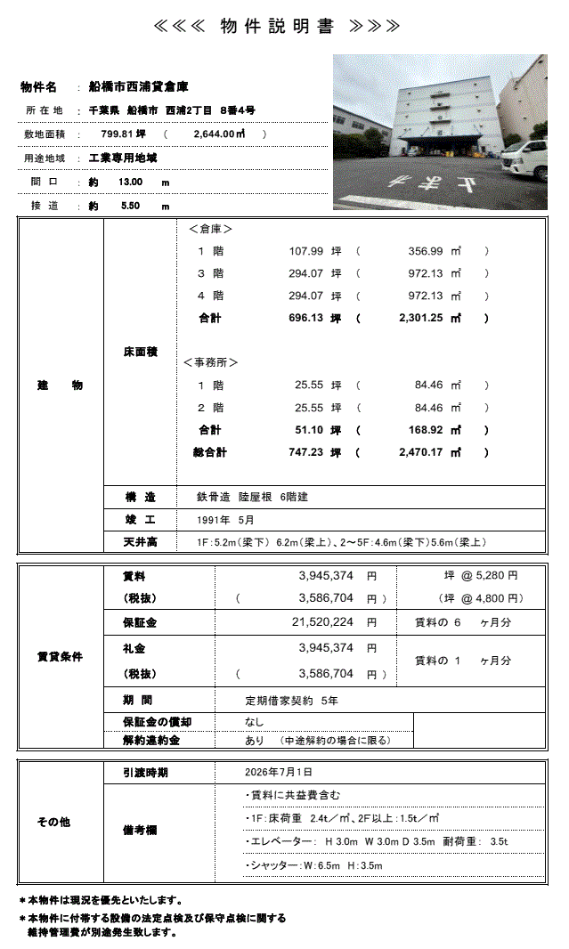 *5年定期建物賃貸借契約 *天井高:1階梁下5.2m、梁上6.2m、2階以上梁下4.6m、梁上5.6m *中途解約時、解約違約金あり *床荷重:1階2.4t/m2、2階以上1.5t/m2 ※写真は、以前の募集当時に撮影したものなので、現況と異なる場合があります。現況優先となります。 |