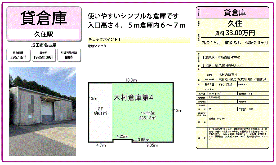 成田線/久住駅 徒歩20分以上 圏央道「下総IC]より車で8分 |
