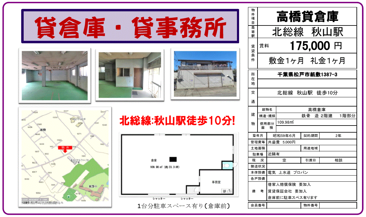 | 沿線/駅 | 北総線/秋山駅 徒歩10分 | 高速道路出入口 | |