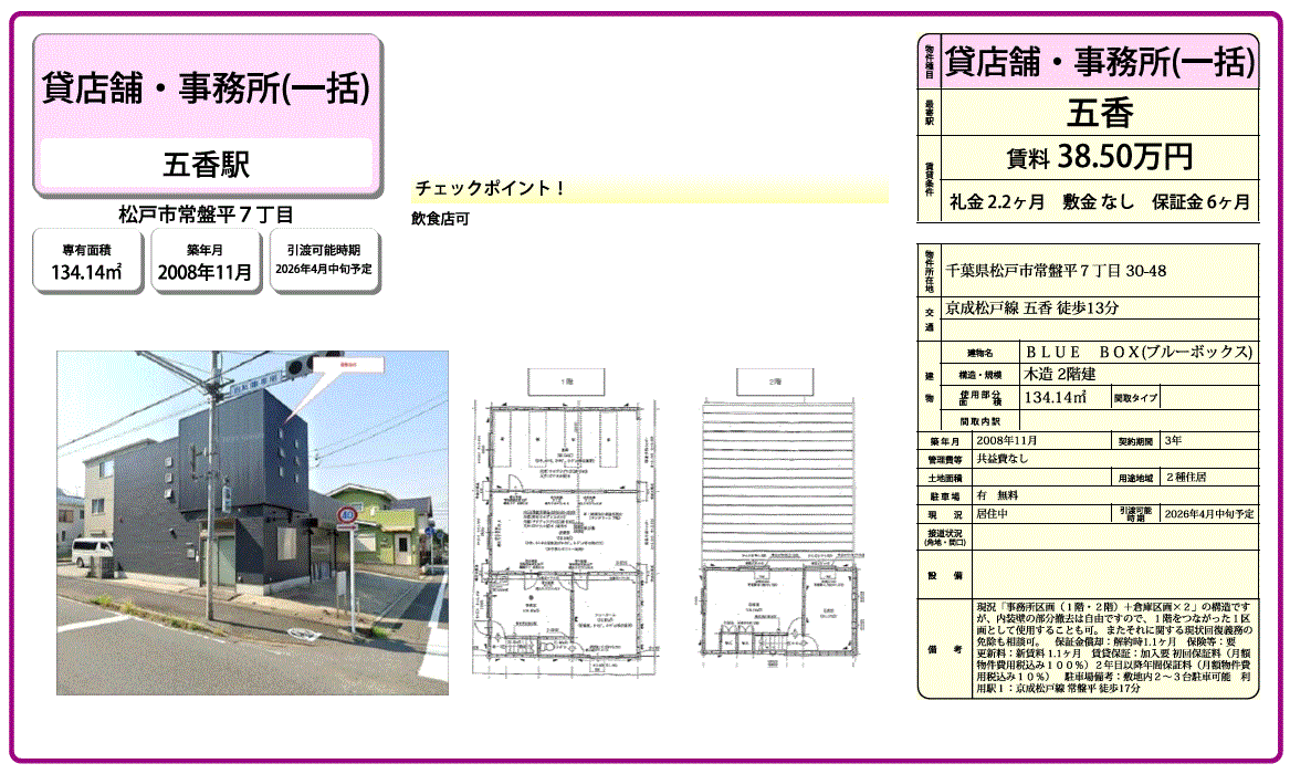 | 沿線/駅 | 京成松戸線/五香駅 徒歩13分 | 高速道路出入口 | |