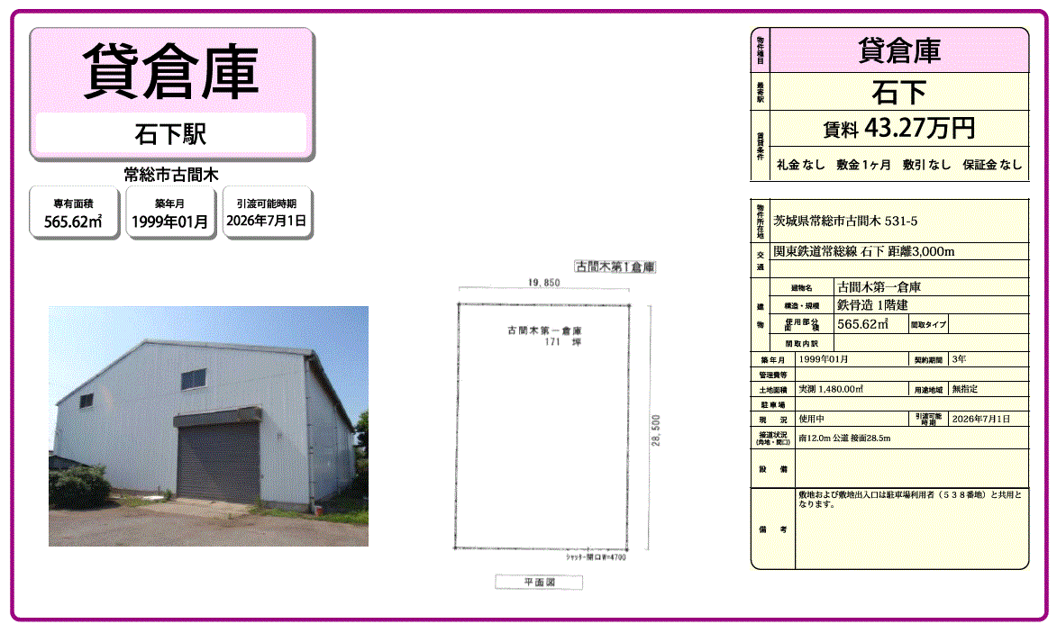 | 物件番号 | 8000484 | 物件種目 | 倉庫 |