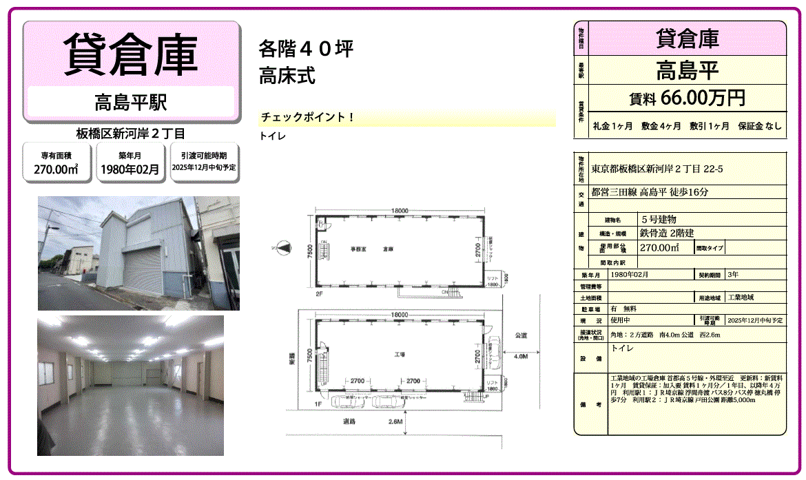 ★おすすめポイント★:2階建貸倉庫、工場 リフト有 工業地域 駐車スペース付