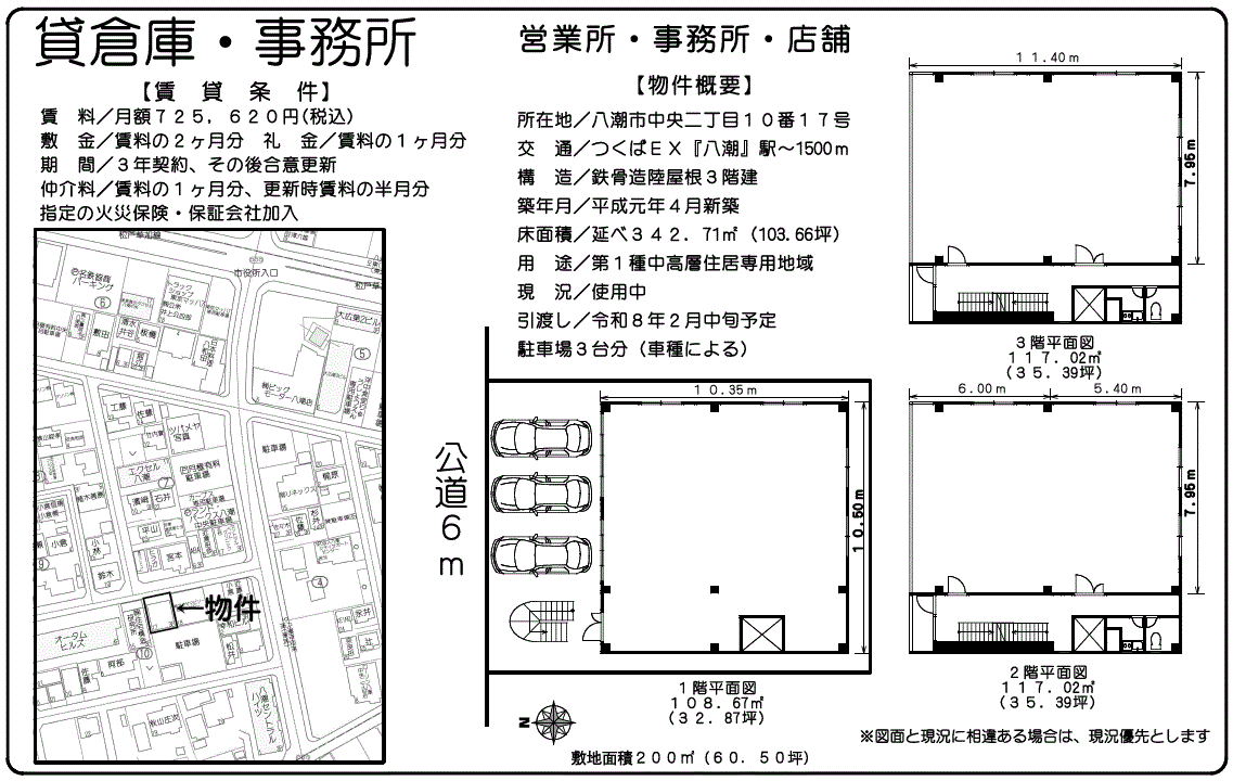 | 各階面積 | 1F:108.67m²/32.87坪 2F:117.02m²/35.39坪 3F:117.02m²/35.39坪 |
