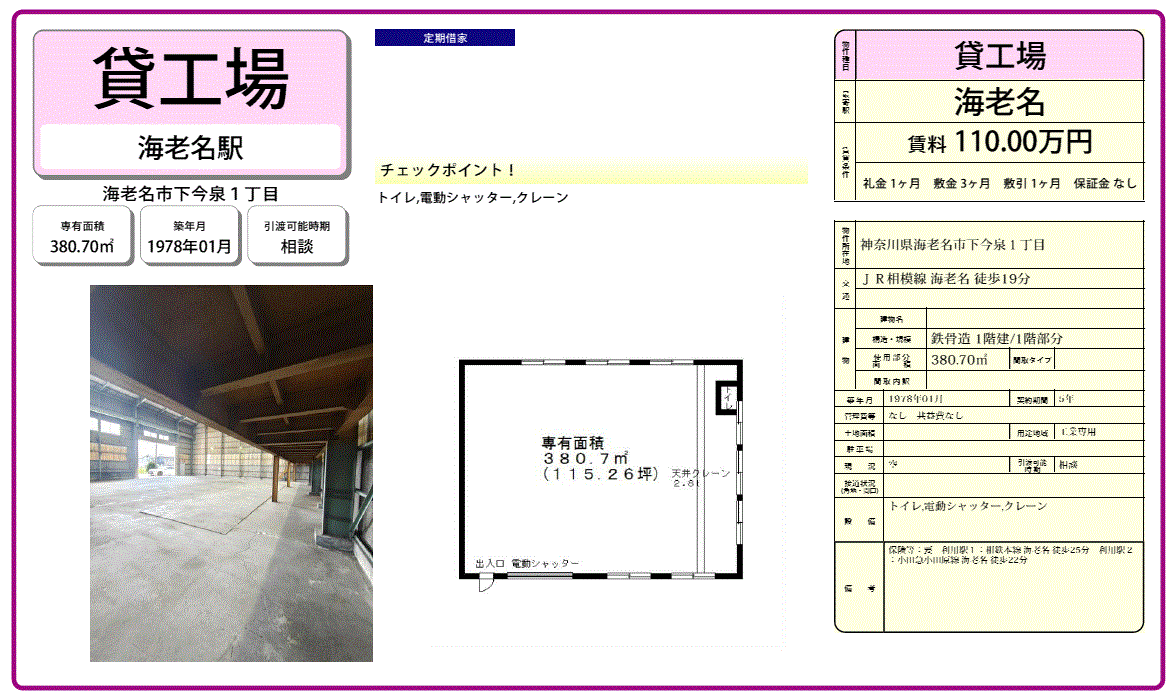 電気引き込み有 上水道 本下水 電動シャッター 2.8tクレーン トイレ |