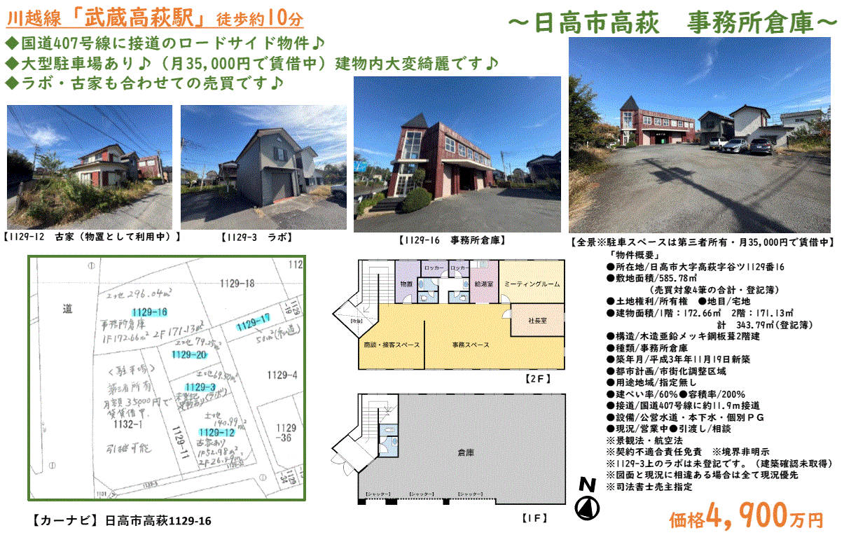 ※前面敷地部分は対象外(月額35,000円賃借中、引継ぎ可能) *契約不適合責任免責 *境界非明示 *未登記建物有り *売主指定司法書士 |